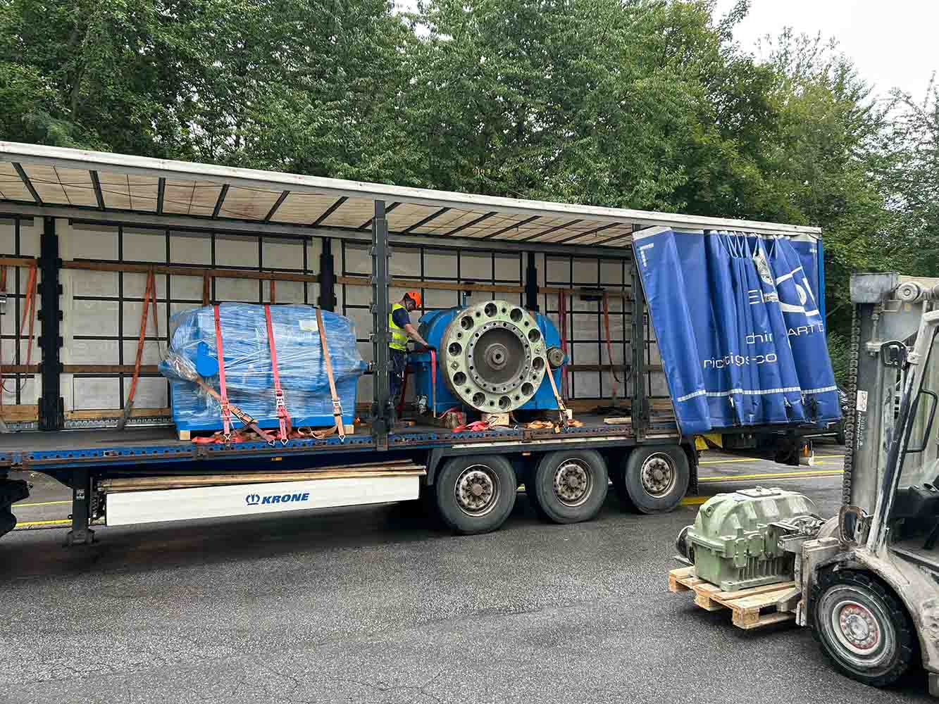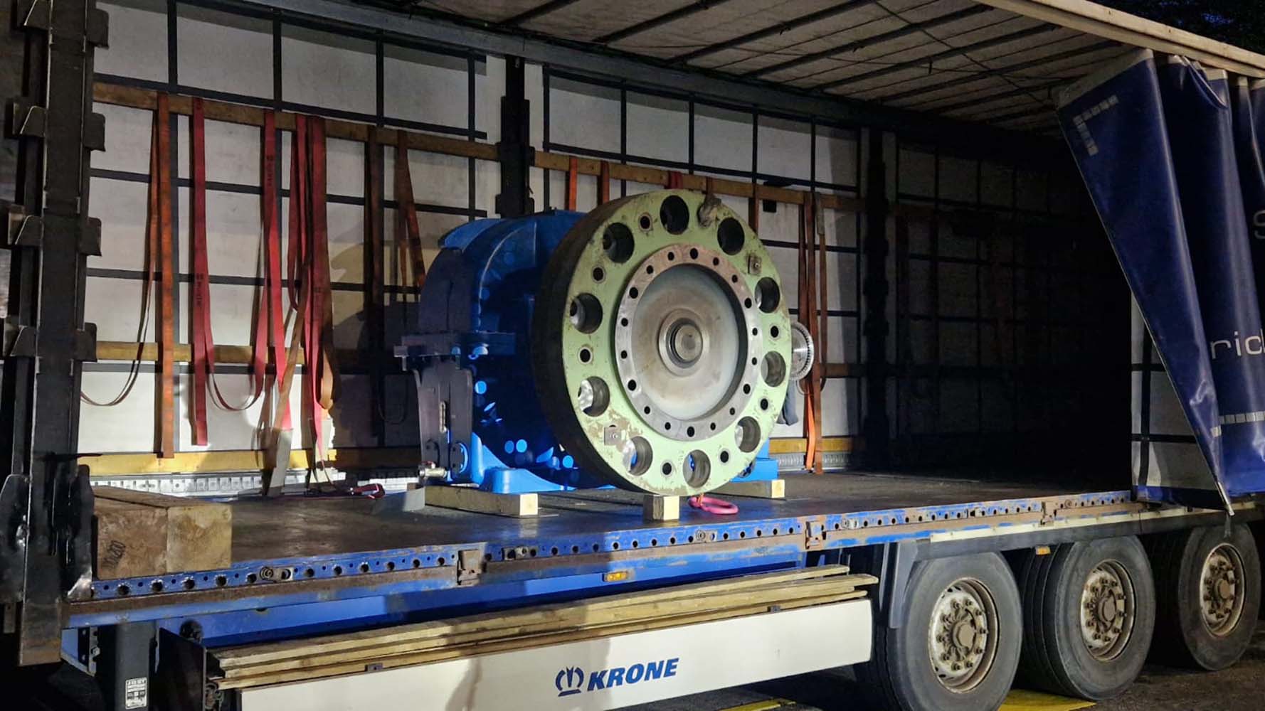 Nach laseroptischer Erfassung der Ist-Ausrichtung wurden Haupt- und Hilfsantrieb inklusive Motoren fachgerecht entkuppelt, demontiert und per Direkttransport ins Werk Arnsberg verbracht. Die Transporte erfolgten abgestimmt und terminsicher mit firmeneigenem LKW.