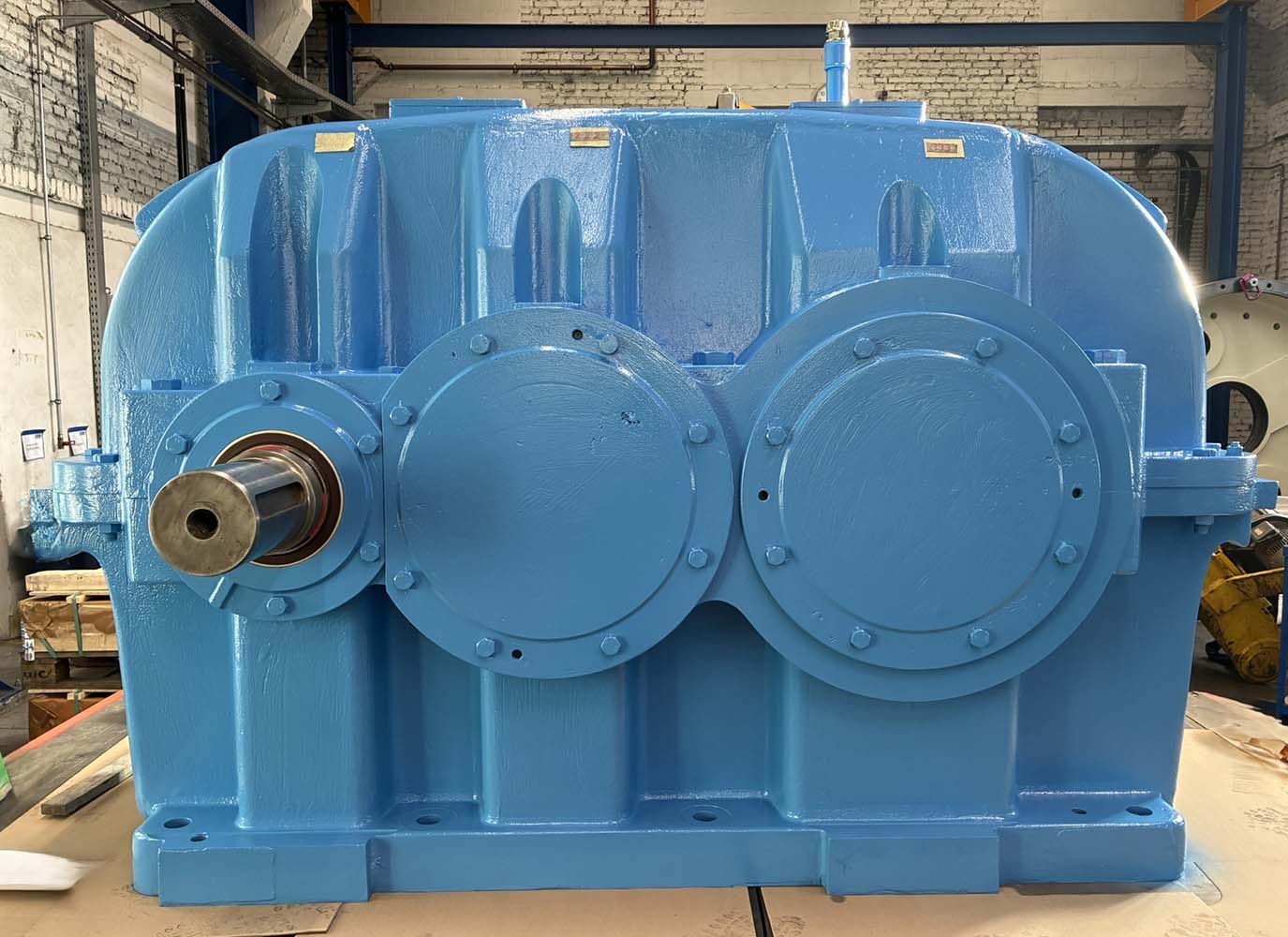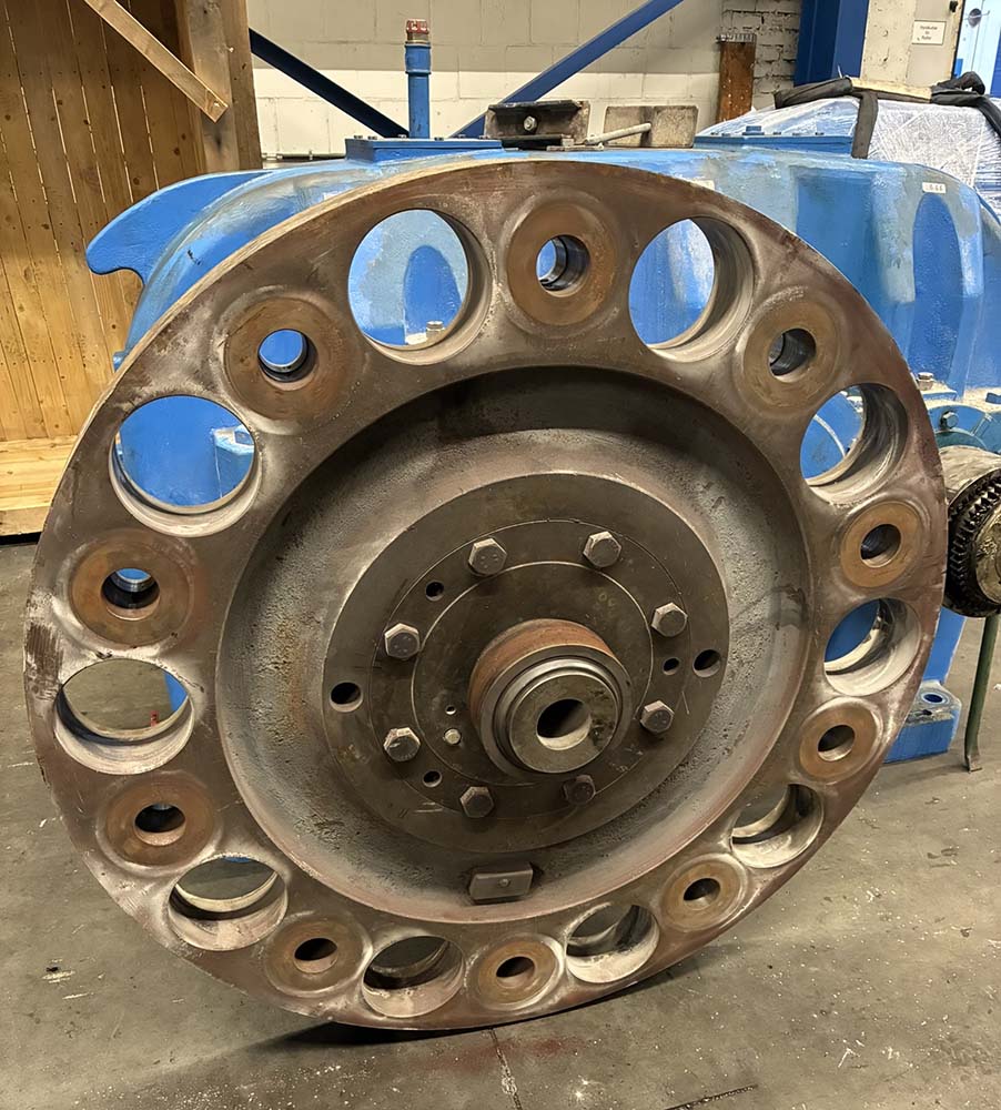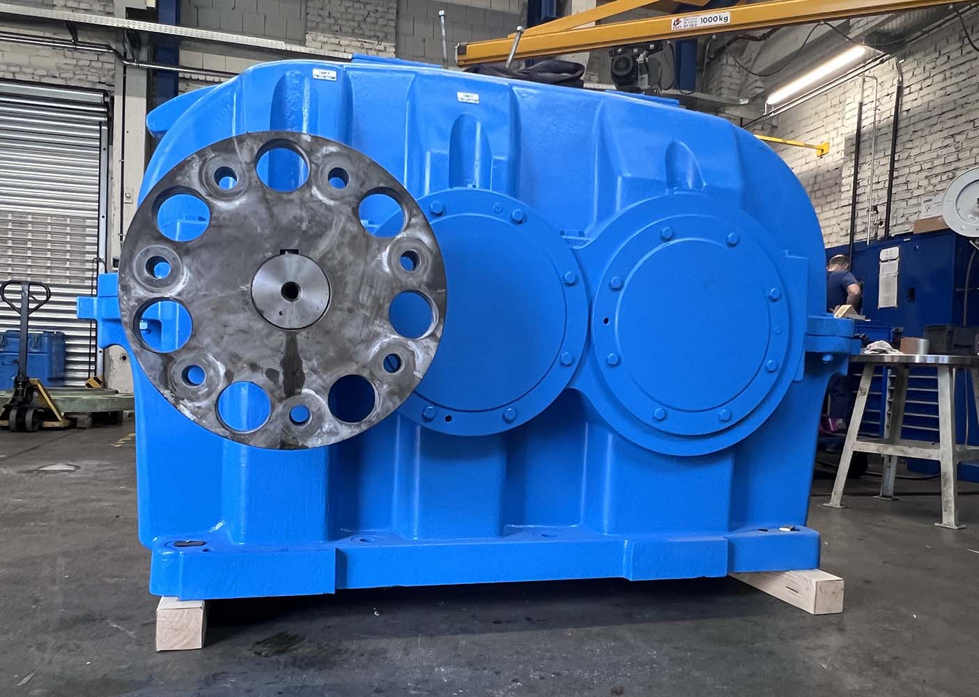 Parallel dazu erfolgte der Umbau des Hauptantriebs: Kupplungen wurden vom Altgetriebe übernommen, instandgesetzt und am Neugerät montiert. Nach Abschluss aller Arbeiten wurden beide Antriebe lackiert, verpackt und direkt zur Baustelle geliefert.