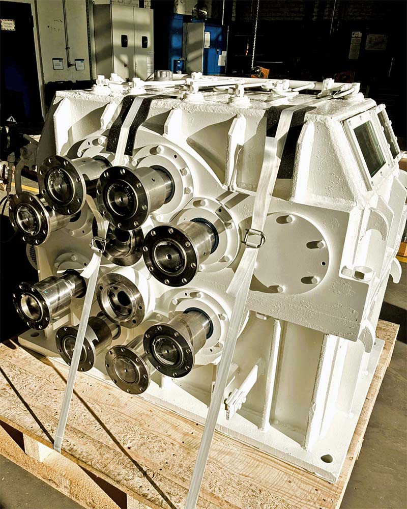 Thanks to close coordination with our reliable partners, special transports with our own fleet of vehicles, prioritized and professional refurbishment of the bearing seats, the schedule could be met and the gearbox was delivered on time for the planned reinstallation.